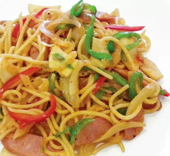 当店おすすめは、店長が自ら腕を振るうナポリタンスパゲティー(45元)。調理中は、店内にジュ~ッというおいしそうな音と香り。たまねぎとウインナーをふんだんに使った一品で、まさに日本で食べたあのナポリタン。