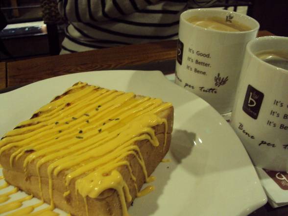 ガーリックの香りとチーズの甘い香りがしっかり効いたトーストです。中にもチーズも入っていて、ハオチー。カットしてあるので、食べやすさも抜群。切ったら、中からとろ~りチーズ。